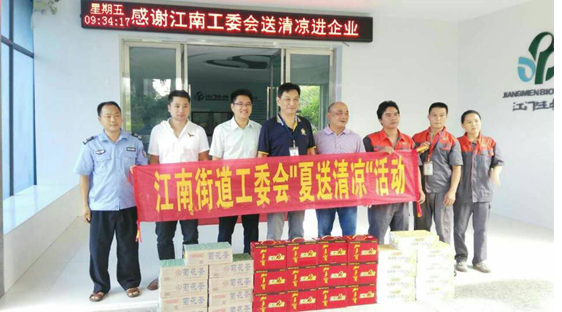 2017年7月14日,江门市江南街道工委干部职工冒着高温酷暑,深入到企业第一线,开展“夏日炎炎送清凉、人文关怀促和谐”活动,给坚守岗位的生产一线员工送上了丝丝凉意。